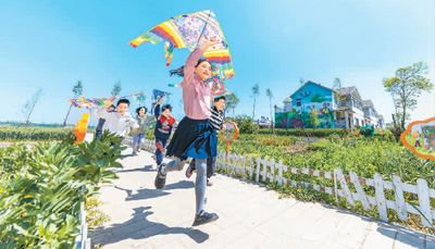 孩子們在江蘇省泗洪縣石集鄉(xiāng)柳山新居“小菜園”放風箏 張連華 攝