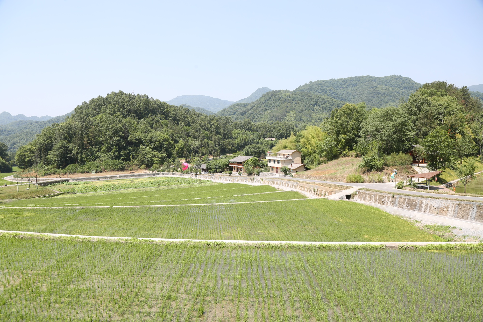 仲夏,朱鹮及伴生鳥白鷺自由翱翔,漠漠荷塘、稻田間荷花盛開,水稻和蓮藕生長在富硒地上,自然古村落的“詩意田園”,近在咫尺。