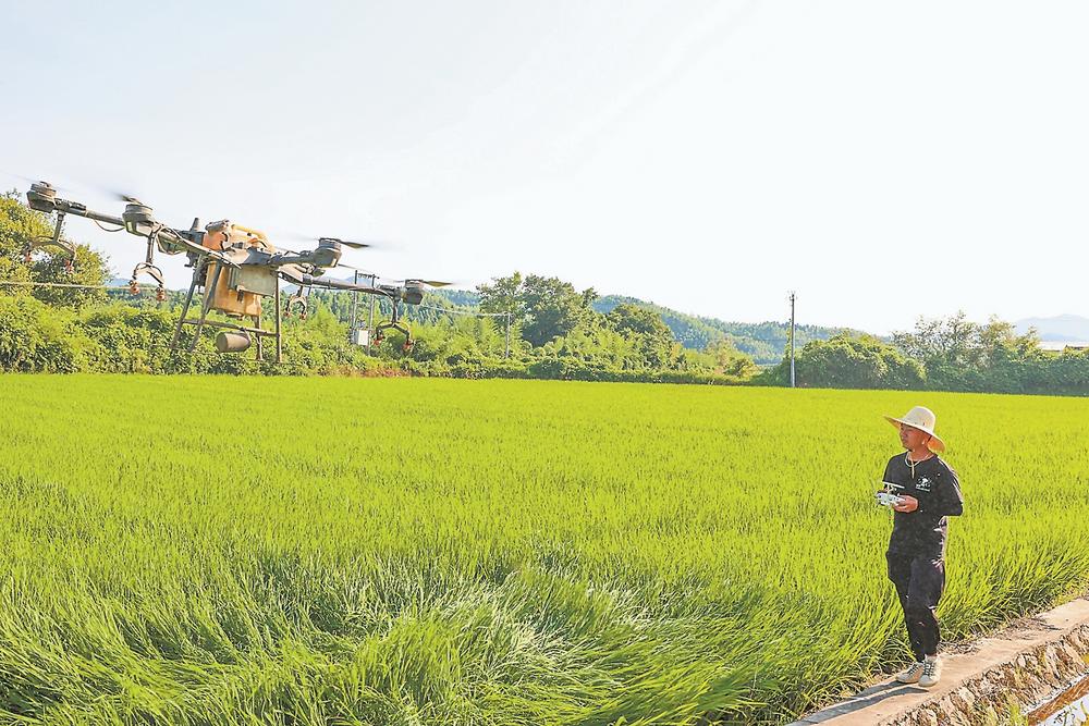 三明市的一位農(nóng)戶在田間地頭操作無人機撒播農(nóng)藥(資料圖片)