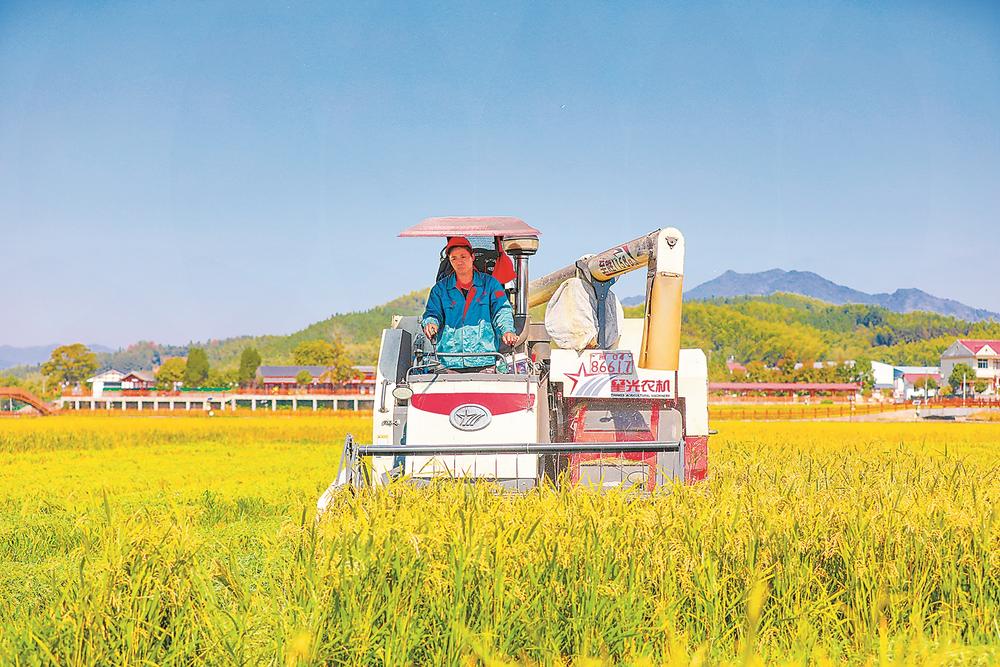 在三明一處稻田里,現(xiàn)代化的收割機正在作業(yè)(資料圖片)