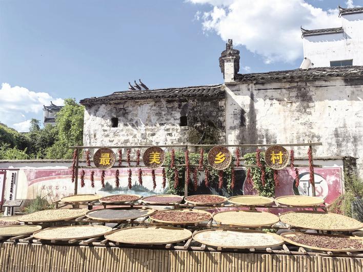在石門村,自然風(fēng)光與文化底蘊交相輝映。村內(nèi)廣場上,一排排曬盤盛滿了紅豆、玉米、辣椒等農(nóng)產(chǎn)品,展現(xiàn)了婺源人傳統(tǒng)的曬秋習(xí)俗。