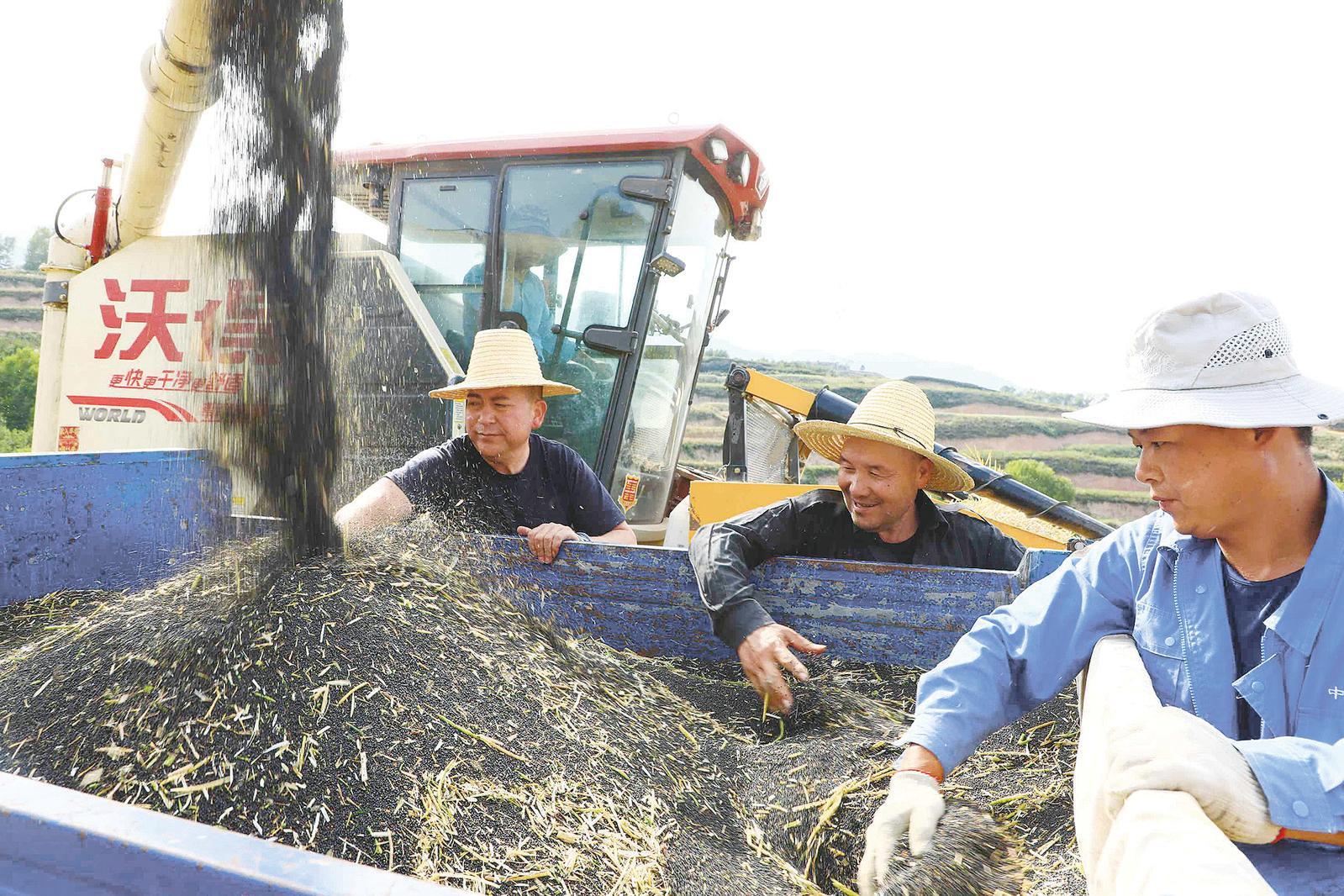 在一處坡洼的田塊里,一臺聯(lián)合收割機正在卸糧,收獲的油菜籽從卸糧口傾瀉而下,倒入三輪車斗里?!斑@塊田以前是撂荒地,我們合作社流轉(zhuǎn)后種植了油菜。今年雨水好,看莊稼長勢,油菜籽畝均產(chǎn)量至少在150公斤以上?!睆埣仪f村黨支部書記張斌先和村支部委員寧智祥捧起一把黑黝黝的油菜籽,臉上露出收獲的喜悅。