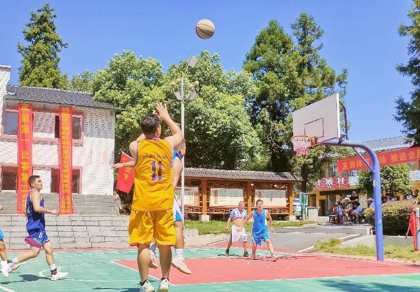 紫溪市鎮(zhèn)樂園村隊隊員在搶投3分球 謝助民 攝