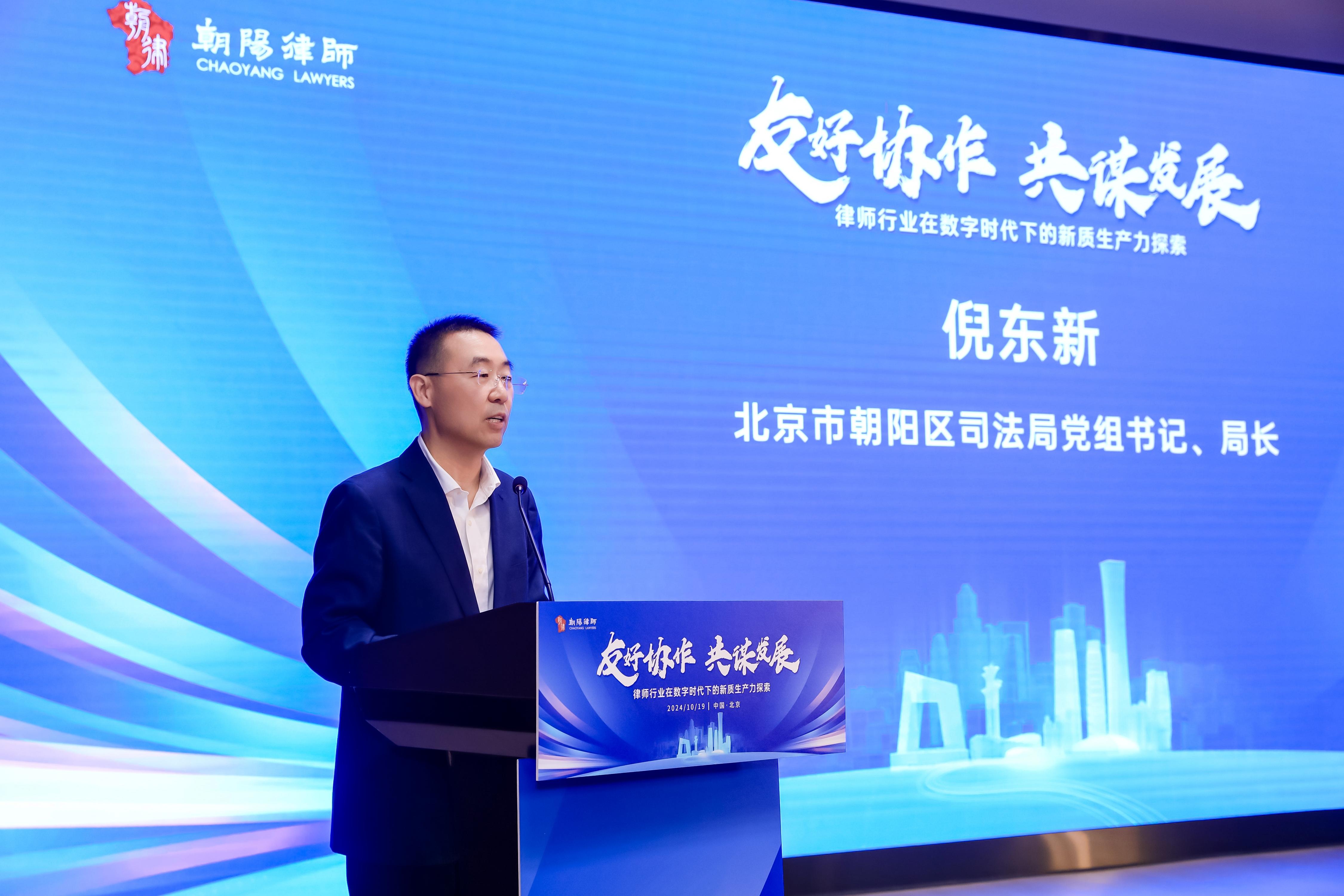 北京市朝陽區(qū)司法局黨組書記、局長倪東新在致辭中表示,朝陽區(qū)一直高度重視律師行業(yè)發(fā)展,努力打造法律服務(wù)業(yè)高地,充分保障律師權(quán)益,不斷完善律師管理體制機(jī)制,積極為律師拓展業(yè)務(wù)、依法執(zhí)業(yè)搭建平臺(tái)。在當(dāng)前數(shù)字經(jīng)濟(jì)迅猛發(fā)展的時(shí)代背景下,在法律服務(wù)業(yè)深化發(fā)展的背景下,希望律師行業(yè)立足新發(fā)展理念,助力新發(fā)展格局,做服務(wù)經(jīng)濟(jì)社會(huì)發(fā)展的推動(dòng)者,做堅(jiān)持公平正義維護(hù)安全穩(wěn)定的守護(hù)者。認(rèn)真履行職責(zé)使命,講政治顧大局,講誠信守規(guī)矩,推動(dòng)解決行業(yè)關(guān)切。以法治力量,努力為經(jīng)濟(jì)社會(huì)發(fā)展,提供解渴管用的法律服務(wù),努力建設(shè)一支政治堅(jiān)定、業(yè)務(wù)精湛、維護(hù)正義、誠信盡責(zé)的高素質(zhì)人民律師隊(duì)伍。