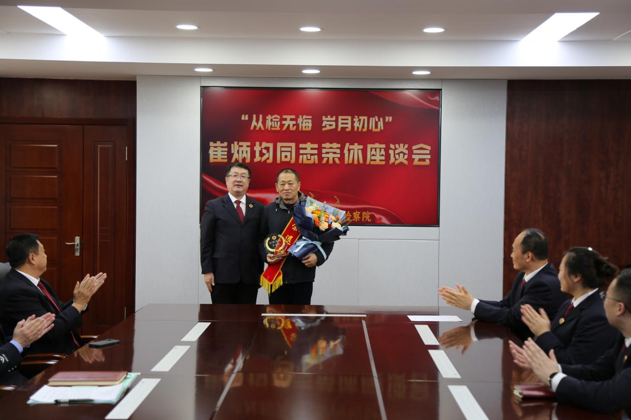 儀式上,院黨組書記、檢察長(zhǎng)王曉輝為崔炳均同志佩戴“光榮退休”紅色綬帶、贈(zèng)送鮮花,頒發(fā)光榮退休紀(jì)念品,并代表院黨組和全體干警致以敬意與祝福,感謝其多年來(lái)為檢察事業(yè)的辛勤與付出。