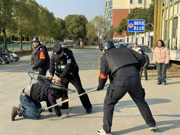 演練期間,一名佯裝以探視幼兒為借口的“歹徒”,手持器械妄圖強(qiáng)行闖入校園。面對(duì)這一“不速之客”,校園保安迅速反應(yīng),當(dāng)即對(duì)歹徒予以勸阻,并即刻啟動(dòng)一鍵報(bào)警系統(tǒng)向公安機(jī)關(guān)報(bào)警,同時(shí)向園內(nèi)應(yīng)急指揮部匯報(bào)情況。相關(guān)責(zé)任教師在警報(bào)拉響后,迅速且有條不紊地將正在戶外開展活動(dòng)的幼兒疏散至安全地帶。應(yīng)急小組、校園保安與在場(chǎng)民警緊密協(xié)作,運(yùn)用防暴盾牌筑起堅(jiān)固防線進(jìn)行格擋防御,借助鋼叉巧妙干擾歹徒的行動(dòng)。憑借彼此間的高度默契配合,逐步縮小對(duì)歹徒的包圍圈。在全體現(xiàn)場(chǎng)人員的齊心協(xié)力之下,最終成功將歹徒制服。整個(gè)演練流程各個(gè)環(huán)節(jié)緊密銜接、有條不紊,順利達(dá)成預(yù)期目標(biāo)。