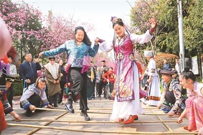 游客在云南省昆明市呈貢區(qū)洛龍公園體驗(yàn)竹竿舞。李發(fā)興 攝