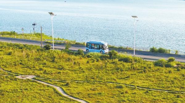 長(zhǎng)沙市天心區(qū),一輛鄉(xiāng)村公交車行駛在湘江風(fēng)光帶。(資料照片)記者 辜鵬博 攝