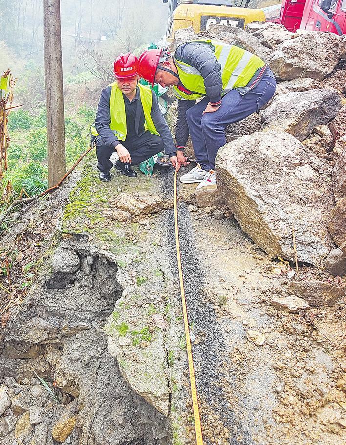 3月14日,秭歸縣芝茅公路,保險公司工作人員在災(zāi)毀路段進(jìn)行查勘核災(zāi)。記者 柯皓 通訊員 王耿 攝
