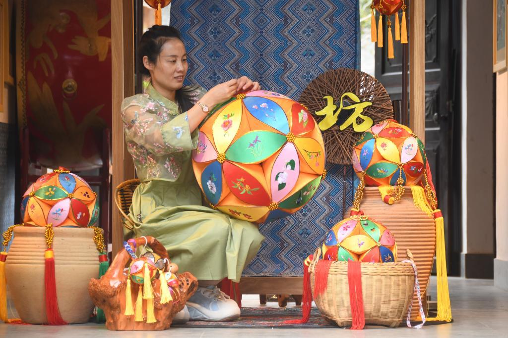 王秀芬如今已成為繡球制作技藝的市級(jí)非遺傳承人。談起繡球文化,王秀芬似乎有說(shuō)不完的話?!袄C球在古代是男女之間的定情信物。比如在‘三月三’,青年男女們會(huì)對(duì)唱山歌,通過(guò)拋繡球的方式傳遞愛(ài)意?!蓖跣惴遗踔粋€(gè)大大的繡球笑著說(shuō),“發(fā)展到今天,繡球已經(jīng)成為友誼和祝福的象征。”