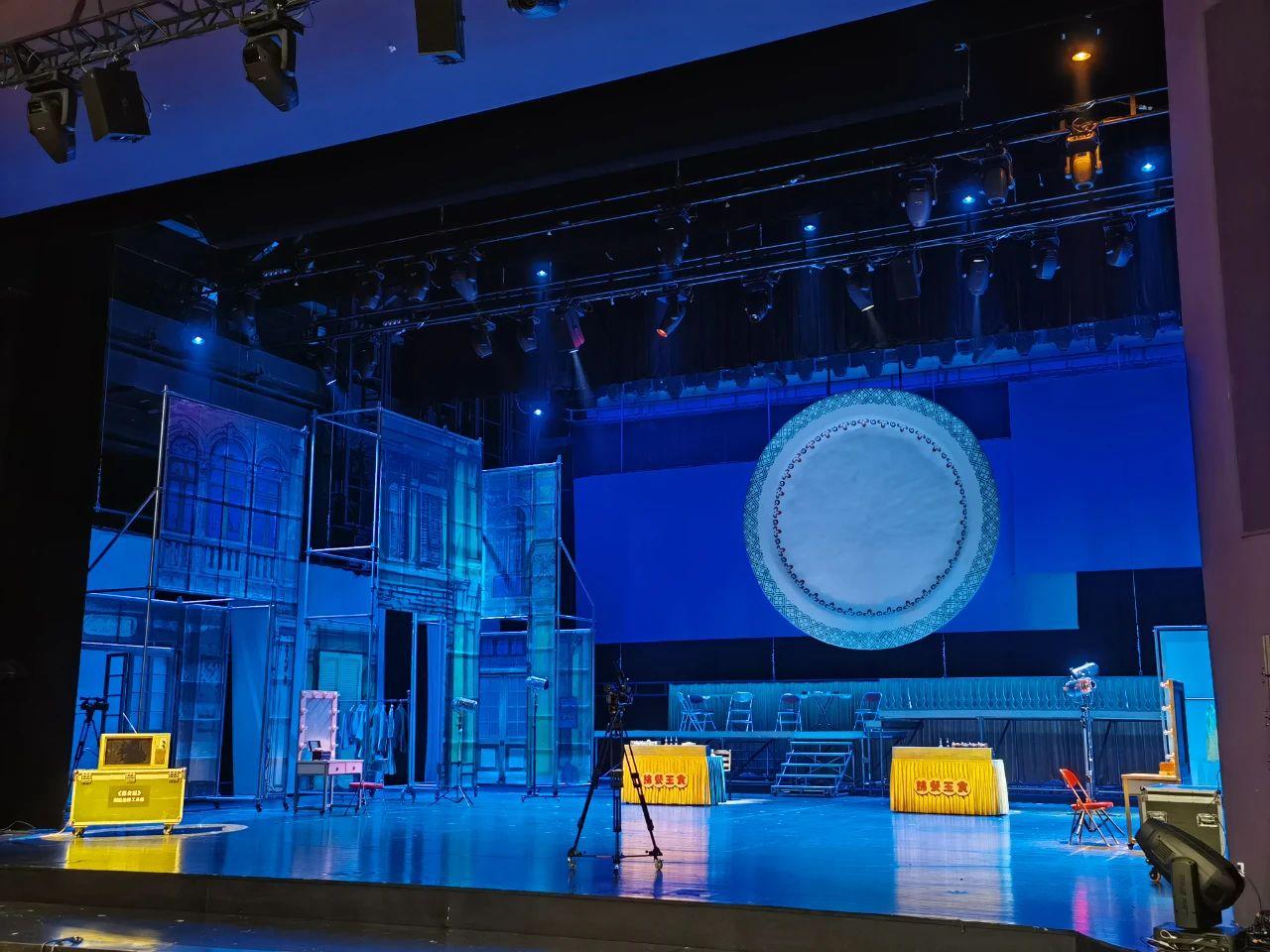 舞臺(tái)上采用廣彩瓷紋樣投影,時(shí)現(xiàn)字幕或特寫(xiě),延伸了舞臺(tái)表演;亦堪當(dāng)電視屏幕,是師徒名廚爭(zhēng)霸現(xiàn)場(chǎng);更是一輪圓月,時(shí)代風(fēng)云際會(huì),日中與夕食,月下共朝歌。有無(wú)相生間,承載的是中國(guó)人的道理。