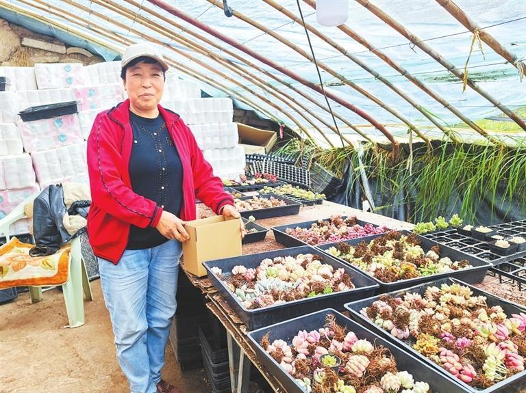 “瞧這些多肉植物小巧可愛,讓城里人親近大自然吧,網(wǎng)上賣得很火。”村民張淑英邊打包裝邊說,“通常老板們上午直播帶貨,下午我們就按照貨單挑貨、抖土、晾干,再裝貨,保持多肉植物不爛根。平時(shí)打理好這些植物,活很輕松,月收入2800元,還能兼顧種好家里5畝地。”