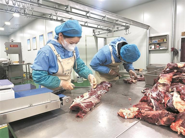 “一只成年藏羊在經(jīng)過(guò)檢疫達(dá)標(biāo)屠宰后,先送至排酸間用保鮮排酸技術(shù)進(jìn)行排酸,再被送進(jìn)這里分割加工、剔骨、修割。”仟戶牧場(chǎng)加工車間工作人員馬玉梅介紹說(shuō)。只見她手持專用刀具,沿著羊肉的肌肉紋理精準(zhǔn)下刀,將藏羊按部位分割成精品羊肋排、羊腿肉(帶骨)、羊脖片等不同區(qū)塊。隨后,新鮮的藏羊肉被快速分揀至不同區(qū)域,有的進(jìn)入真空包裝機(jī)完成封裝,有的則被送往進(jìn)一步加工的流水線。車間里機(jī)器運(yùn)轉(zhuǎn)的低鳴聲與工作人員專注的動(dòng)作交織,每一個(gè)環(huán)節(jié)都嚴(yán)格遵循衛(wèi)生標(biāo)準(zhǔn),確保肉類從分割到成品的全程安全。