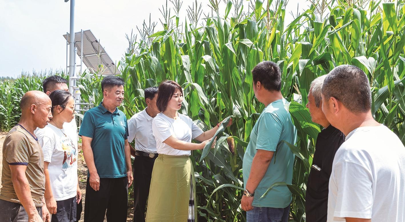 梨樹縣鳳凰山農(nóng)機(jī)農(nóng)民專業(yè)合作社理事長韓鳳香正在和村民們查看玉米授粉和長勢情況。高鴻 攝