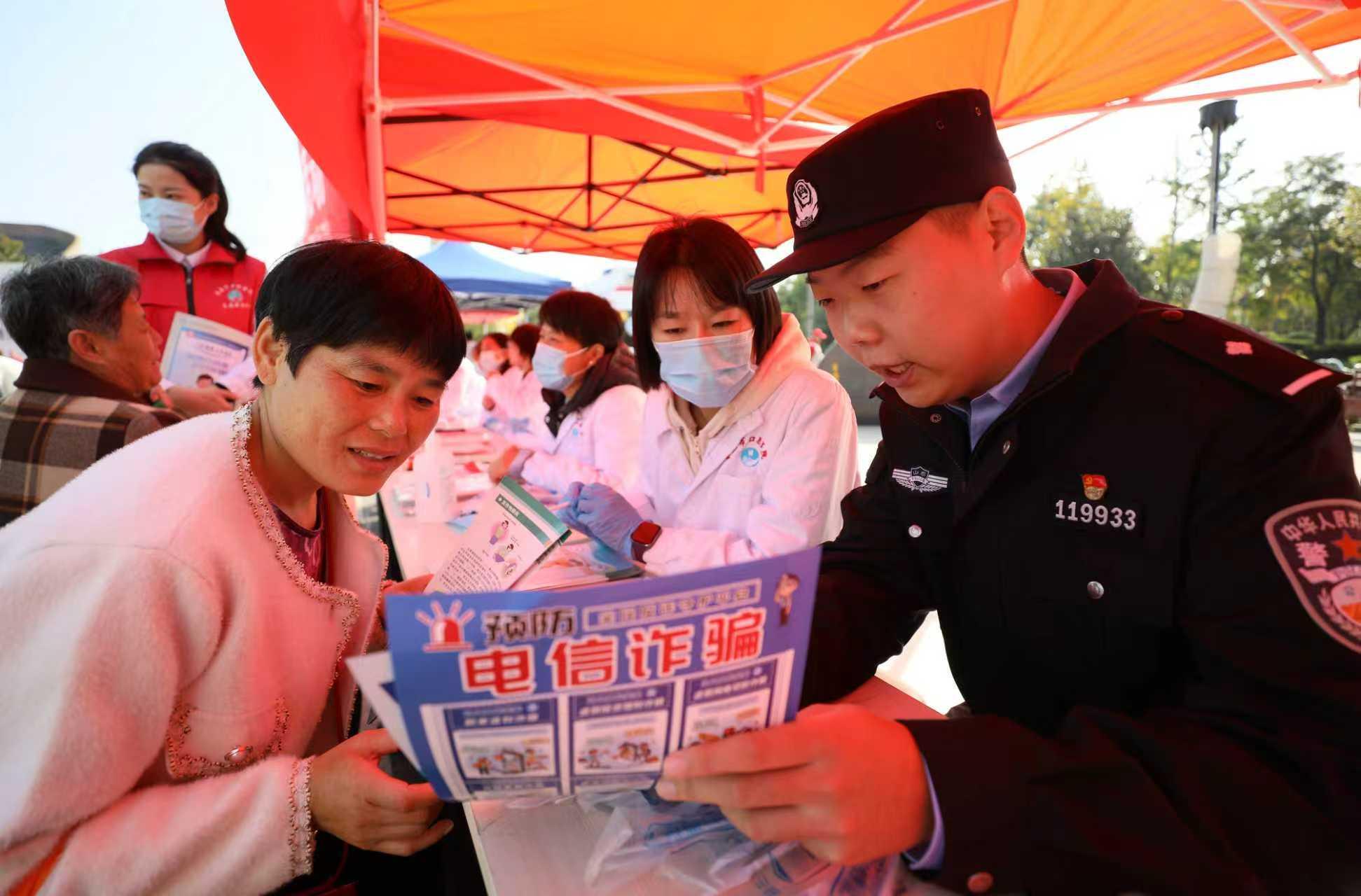 10月29日,在山東省棗莊市臺兒莊區(qū)興中廣場,民警在向前來義診的市民普及防范電信網(wǎng)絡詐騙知識。當日是農歷九月初九,2025年棗莊市暨臺兒莊區(qū)“敬老月”重陽節(jié)健康義診活動在此舉行,在做好為廣大居民義診的同時,臺兒莊區(qū)衛(wèi)生健康局邀請臺兒莊公安分局反詐民警,向前來義診的市民發(fā)放防范電信網(wǎng)絡詐騙宣傳彩頁,普及相關知識,告訴大家在就醫(yī)就診過程中要切實提高電信網(wǎng)絡詐騙防范意識。(山東省棗莊市公安局臺兒莊分局 張嚴新)