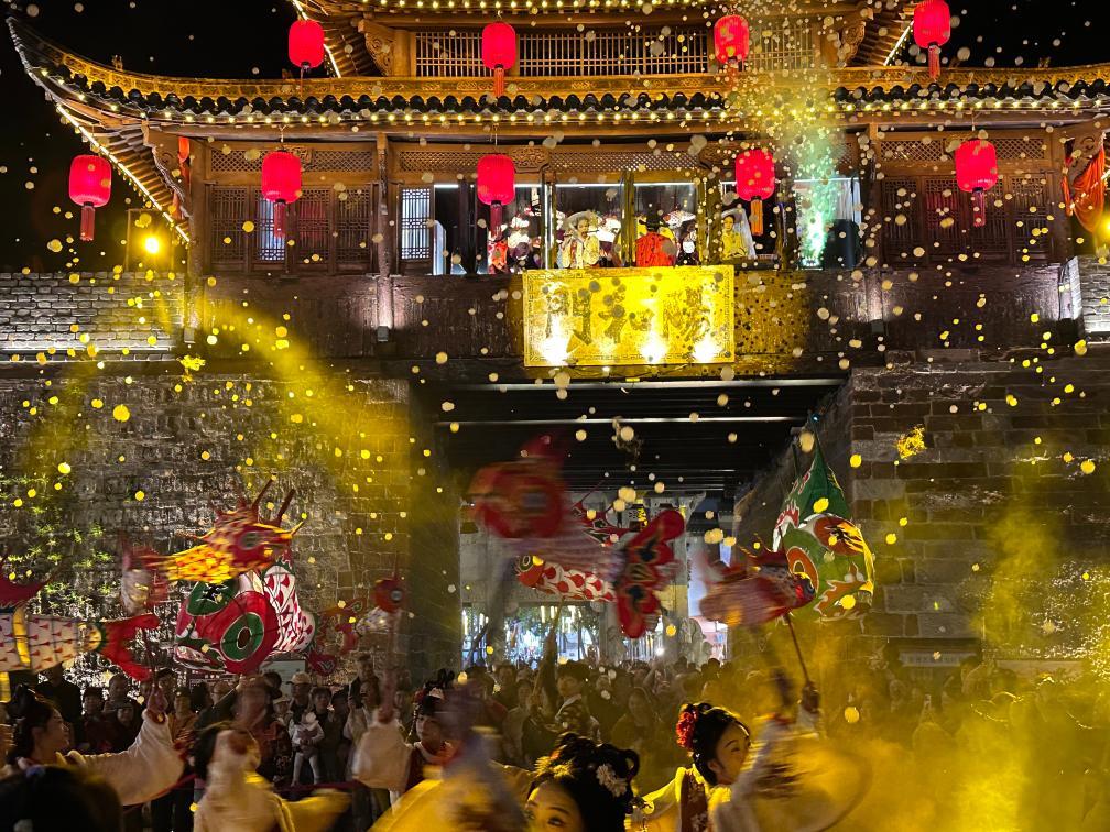 夜色漸濃,安徽歙縣徽州古城陽和門上鼓聲乍起,一盞盞流光溢彩的魚燈應(yīng)聲游走,穿梭于黛瓦飛檐間。光影搖曳中,詩人筆下“鳳簫聲動,玉壺光轉(zhuǎn),一夜魚龍舞”的盛景在徽州大地復現(xiàn)。