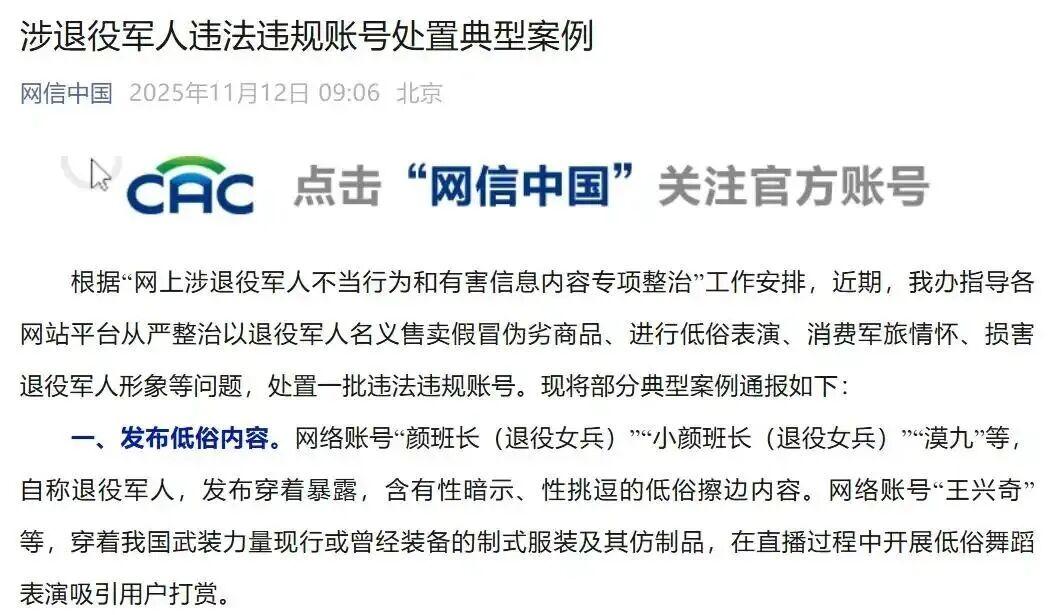 日前,中央網(wǎng)信辦通報(bào)一批涉退役軍人違法違規(guī)賬號(hào)處置典型案例,“顏班長(zhǎng)(退役女兵)”“宋班長(zhǎng)(正能量)”等一批以退役軍人名義售賣(mài)假冒偽劣商品、進(jìn)行低俗表演、傳播虛假信息等損害軍人軍隊(duì)形象的違法違規(guī)賬號(hào)被依法查處。