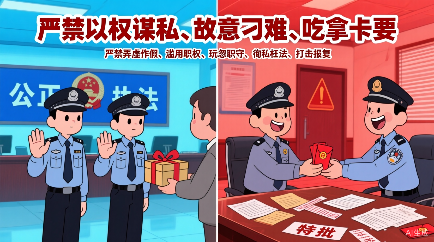 嚴(yán)禁以權(quán)謀私、故意刁難、吃拿卡要、弄虛作假、濫用職權(quán)、玩忽職守、徇私枉法、打擊報(bào)復(fù)。嚴(yán)禁從事有礙公正執(zhí)法的活動(dòng)。嚴(yán)禁違規(guī)從事營(yíng)利性活動(dòng)。嚴(yán)禁違規(guī)向管理服務(wù)對(duì)象收取或攤派財(cái)物、要求其提供服務(wù)。嚴(yán)禁干預(yù)執(zhí)法活動(dòng)、插手具體案件、過問案情。