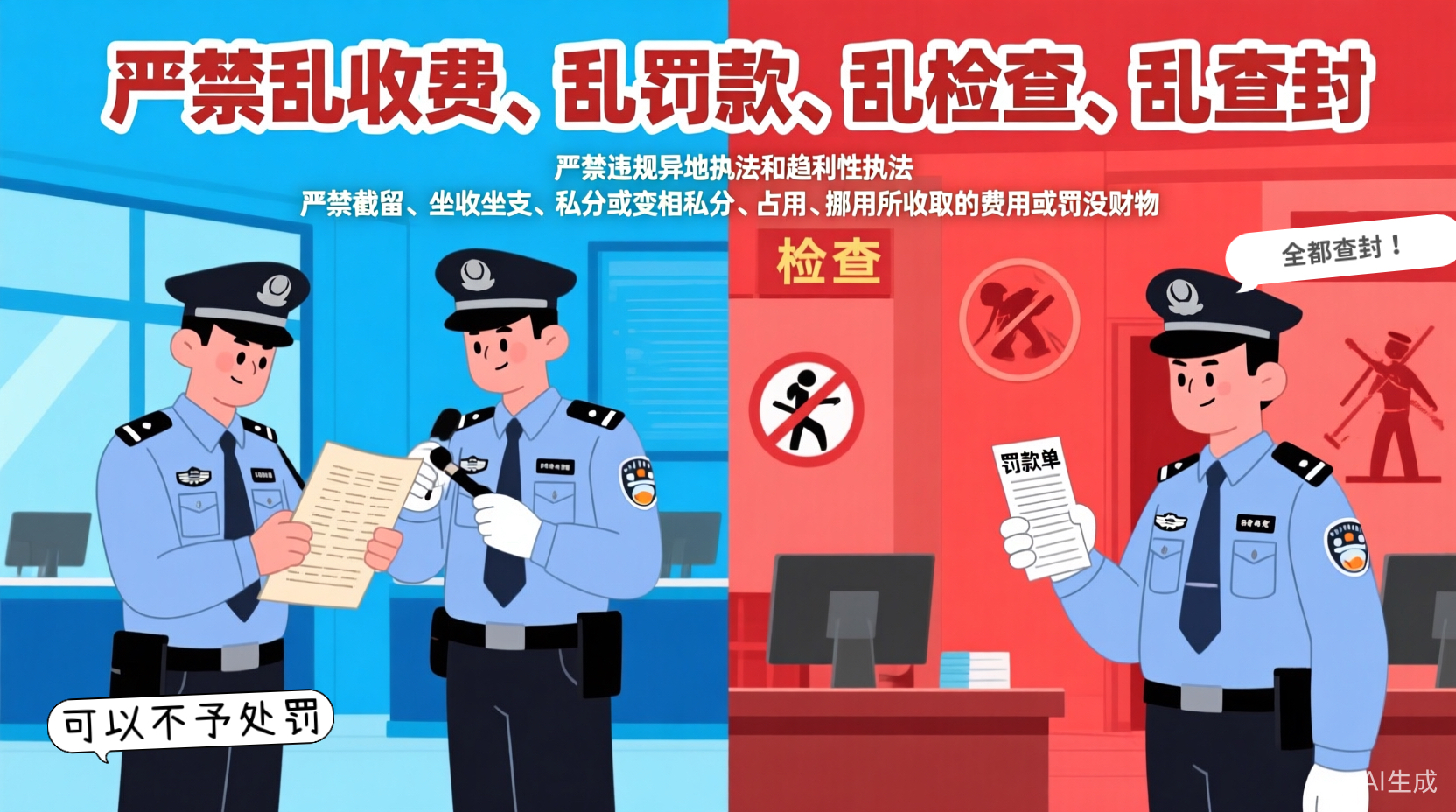 嚴(yán)禁亂收費(fèi)、亂罰款、亂檢查、亂查封。嚴(yán)禁違規(guī)異地執(zhí)法和趨利性執(zhí)法。嚴(yán)禁下達(dá)或變相下達(dá)罰沒指標(biāo)。嚴(yán)禁截留、坐收坐支、私分或變相私分、占用、挪用所收取的費(fèi)用或罰沒財(cái)物。