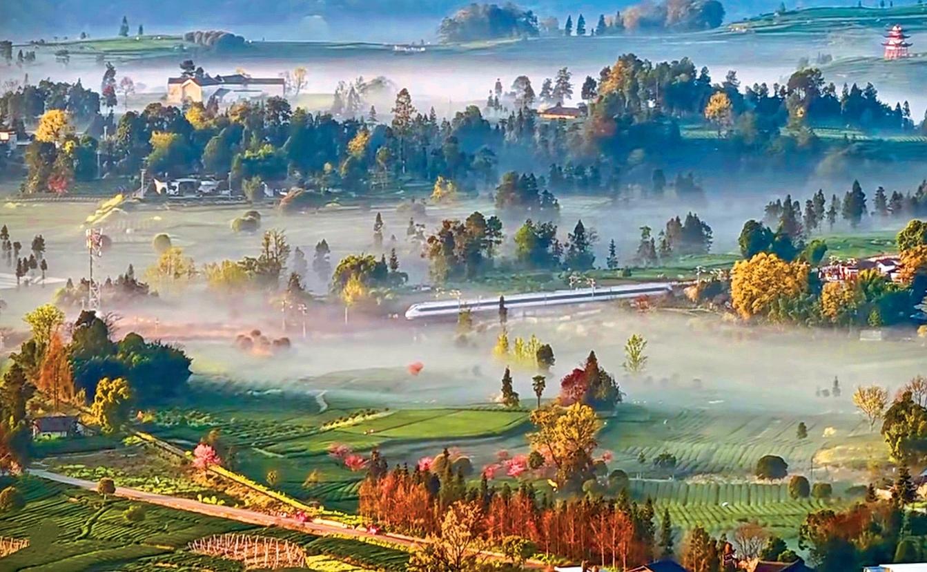 近日,一段拍攝于四川省雅安市名山區(qū)的茶園航拍視頻火爆全網(wǎng),更登上央視新聞、人民日報等多家中央級媒體平臺,讓名山的春日茶景驚艷全國。畫面里,朝霞映照茶山,晨霧繚繞在層層疊疊的茶壟間,一列動車如銀龍穿梭其間,車影與薄霧相融,金黃晨光與翠綠茶田相映,遠處村落若隱若現(xiàn),宛若現(xiàn)實版《千里江山圖》,被網(wǎng)友盛贊“每一幀都是壁紙”。