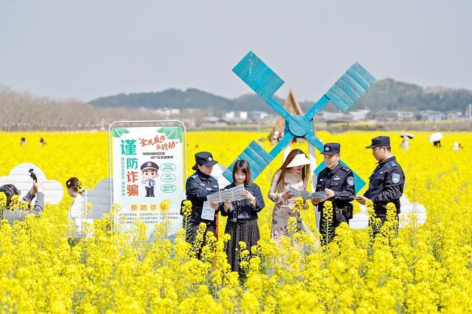 “賞花拍照,請看管好手機錢包!”“所有刷單都是詐騙,陌生鏈接千萬別點!”花海步道上、游客休憩點旁,民警輔警手持宣傳冊,穿梭在人群中。涪城區(qū)分局楊家派出所副所長魯?shù)铝终龓ш犜诤诵膮^(qū)域值守,他一邊協(xié)調現(xiàn)場秩序,一邊向往來的游客講解最新騙局。響亮的提醒聲和著花香,飄進游客心里。