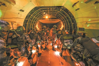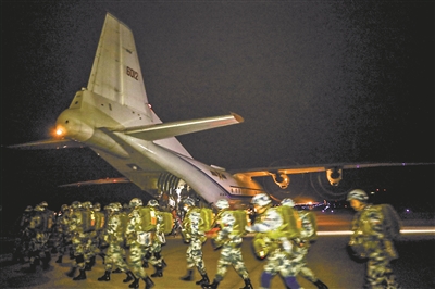 凌晨4時(shí),數(shù)架滿載全副武裝傘兵的大型運(yùn)輸機(jī),依次騰空而起向預(yù)定空域機(jī)動(dòng)。