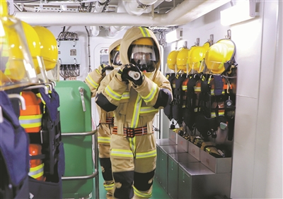 “后機(jī)艙起火!”剛剛處置完“敵”情,成都艦又遇險(xiǎn)情。戰(zhàn)救小組人員迅速切斷電源、提取滅火器、鋪放水龍帶……