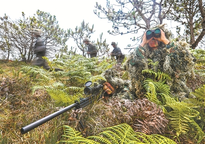 圖③:戰(zhàn)術(shù)演練中,擔(dān)當(dāng)狙擊手的新戰(zhàn)士占領(lǐng)有利地形,掩護突擊組行動。