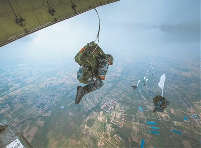 “跳!跳!跳!”綠色離機(jī)信號燈亮起,傘兵從高空躍下,直撲“作戰(zhàn)”區(qū)域。成功著陸傘兵迅速解脫傘具、整理武器裝備,在夜色掩護(hù)下向目標(biāo)地域發(fā)起沖擊。