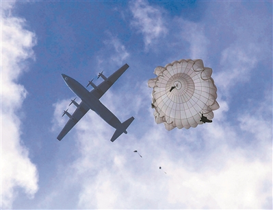 上午8時許,滿載傘兵的運(yùn)輸機(jī)騰空而起。到達(dá)預(yù)定空域后,傘兵們聽從投放員口令,成雙路隊形依次躍出機(jī)艙。瞬時,朵朵傘花綻放于藍(lán)天。