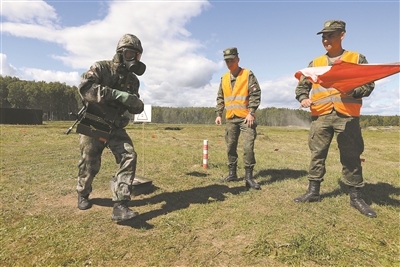 “安全環(huán)境”項目比賽前,我軍參賽隊員(左)進行單組賽適應性訓練。傅道永攝