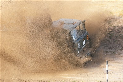 8月27日,在“汽車能手”項目接力賽中,我軍參賽隊員駕車通過泥坑路段。王世民攝