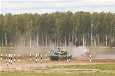 9月1日,在“坦克兩項”項目半決賽中,我軍參賽隊703車組在賽道上疾馳。