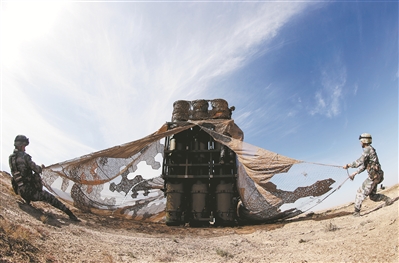 機(jī)動(dòng)途中,“敵情”不斷,險(xiǎn)象環(huán)生。官兵們克服大漠行軍風(fēng)沙漫天等不利因素,臨危不亂,沉著應(yīng)對(duì)。部隊(duì)剛剛抵達(dá)預(yù)定陣地,就接到“敵”偵察機(jī)和武裝直升機(jī)來襲的空情預(yù)警。導(dǎo)彈分隊(duì)與火炮分隊(duì)立即展開火力裝備,投入戰(zhàn)斗。