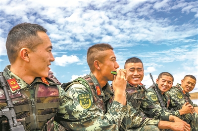 圖④:休整時,下士趙發(fā)(左二)吹奏口琴為戰(zhàn)友們緩解壓力。