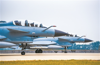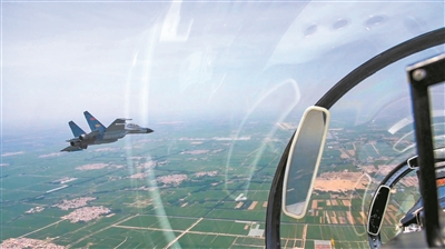 “發(fā)現(xiàn)目標(biāo),按攻擊隊形攔截!”正在某空域巡邏的長機飛行員殷凡明發(fā)現(xiàn)“敵”機,迅速協(xié)同僚機飛行員張瑋前出攔截,一場空中戰(zhàn)斗隨即打響。