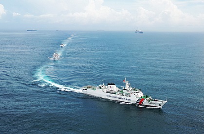 圖為海警艦艇編隊對轄區(qū)重點海域?qū)嵤┏B(tài)巡查。曾文 攝