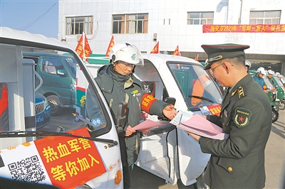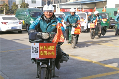 “征兵固防,安國興邦”“一人參軍,全家光榮” ……連日來,在江蘇省海安市的街頭巷尾,一輛輛飄揚著征兵宣傳彩旗的郵車穿梭不停。春季征兵開始后,該市人武部與郵政公司攜手展開征兵宣傳。100多名郵遞員主動報名,30個郵政網(wǎng)點提供支持,摩托、三輪等郵車成為征兵宣傳流動驛站。