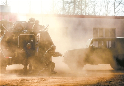 導(dǎo)調(diào)組下達(dá)“敵情”通報(bào):“‘暴恐分子’駕駛一輛越野車企圖沖擊我執(zhí)勤卡點(diǎn),迅速對(duì)其實(shí)施攔阻……”特戰(zhàn)隊(duì)員搭乘防暴裝甲車前去處置,途中遇到“暴恐分子”駕車加速?zèng)_來。在距離不足兩米遠(yuǎn)的地方,裝甲車駕駛員猛地轉(zhuǎn)向、剎車,橫擋在越野車前方將其截停。官兵隨即沖下車,將“暴恐分子”一舉抓獲。
