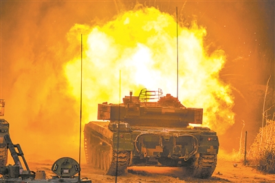 “全車注意!沖擊!……”考核現(xiàn)場,各車組官兵駕乘坦克高速駛?cè)肷鋼襞艿?,在行進中密切協(xié)同,對隨機出現(xiàn)的目標進行快速搜索判別,并根據(jù)目標種類選擇不同彈種實施打擊。