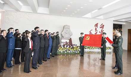 在雷鋒紀念館前,沈陽軍事法院院長陶韜、遼寧省高級人民法院副院長任延忠等50余名軍地法官面向黨旗莊嚴宣誓,重溫入黨誓詞。