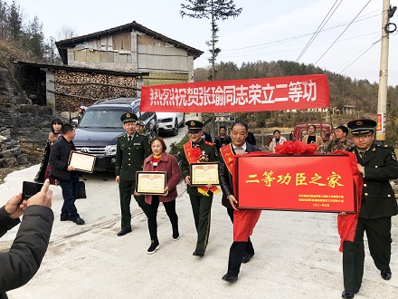 圖為軍地領(lǐng)導(dǎo)將立功喜報(bào)及牌匾送往立功官兵家中。張勇 攝