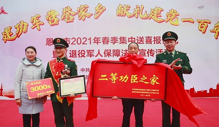近日,武警湖北省總隊(duì)荊門(mén)支隊(duì)聯(lián)合地方政府開(kāi)展“送喜報(bào)到家鄉(xiāng)”活動(dòng),將“二等功臣之家”牌匾及立功喜報(bào)送到荊門(mén)支隊(duì)機(jī)動(dòng)二中隊(duì)班長(zhǎng)張瑜家中,表達(dá)對(duì)立功官兵及家屬的關(guān)懷和問(wèn)候。不少鄰里鄉(xiāng)親也趕到現(xiàn)場(chǎng),敲鑼打鼓、載舞歡歌,一起見(jiàn)證這份榮譽(yù),并送上誠(chéng)摯的祝福。