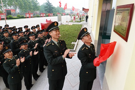 第83集團(tuán)軍某旅“紅一連”官兵在連隊(duì)門(mén)前懸掛“星火燎原”育人基地牌匾。張永進(jìn) 攝