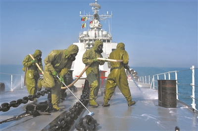 “發(fā)現(xiàn)有毒氣體,人員注意隱蔽!”青島艦拉響戰(zhàn)斗警報,各戰(zhàn)位人員迅速穿戴好防護裝具。防化分隊聞令而動,對艦艇重要部位進行局部洗消。待艦艇高速駛離“染毒”區(qū)域后,立即打開水幕進行全艦洗消。