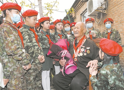 志愿軍老戰(zhàn)士康寶貞給前來看望自己的小學生講戰(zhàn)斗故事。李金良 攝