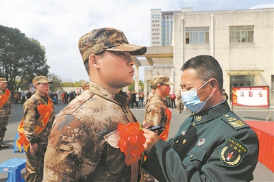 王忠心為新兵佩戴大紅花。武時化 攝