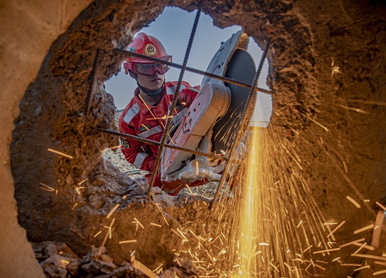 圖為救援分隊(duì)官兵采取安全破拆開(kāi)辟救援通道。