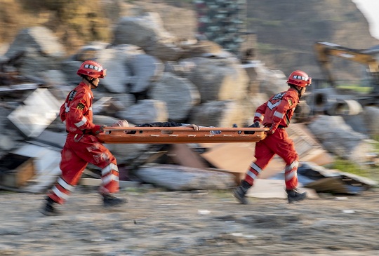 圖為救援分隊(duì)官兵火速轉(zhuǎn)移受傷群眾。