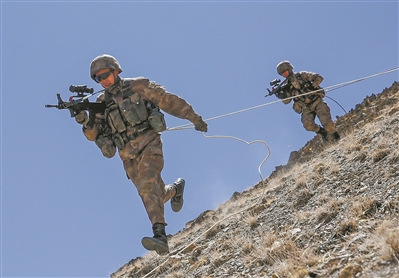 車隊(duì)疾馳30公里后,到達(dá)一片陌生地域?!鞍l(fā)現(xiàn)‘暴恐分子’,實(shí)施抓捕!”連長楊鵬賓一聲令下,各戰(zhàn)斗小組迅速投入戰(zhàn)斗。隊(duì)員們攀登滑降、隱蔽接敵,兵分多路實(shí)施圍剿,成功制服“暴恐分子”。